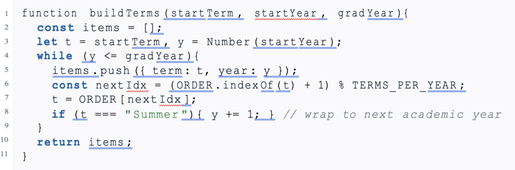 | function build Terms ( start Term , startYear , grad Year ){ const items = []; let t = start Term , y = Number ( start Year ); while ( y <= grad Year ){ items . push ({ term : t, year : y }); const next Idx = ( ORDER . index Of ( t) + 1) % TERMS_PER_YEAR ; t = ORDER [next Idx ]; if ( t === ” Summer “){ y += 1; } // wrap to next academic year } return items ; } |