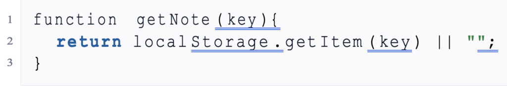 | function get Note ( key ){ return local Storage . get Item ( key ) || “”; } |