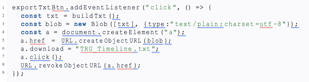 | export Txt Btn . add Event Listener (” click “, () => { const txt = build Txt (); const blob = new Blob ([ txt ], { type :” text / plain ; charset =utf -8 “}); const a = document . create Element (” a”); a. href = URL . create Object URL ( blob ); a. download = ” TRU_Timeline . txt “; a. click (); URL . revoke Object URL ( a. href ); }); |