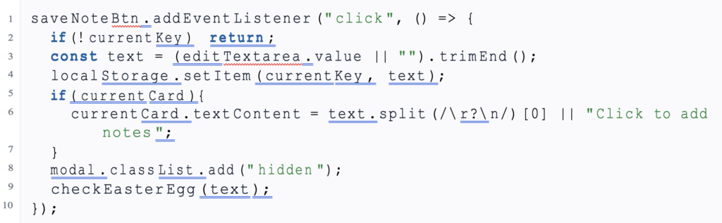 | save Note Btn . add Event Listener (” click “, () => { if (! current Key ) return ; const text = ( edit Textarea . value || “”). trim End (); local Storage. set Item ( current Key , text ); if ( current Card ){ current Card . text Content = text . split (/\ r?\ n/) [0] || ” Click to add notes “; } modal . class List . add (” hidden “); check Easter Egg (text ); }); |