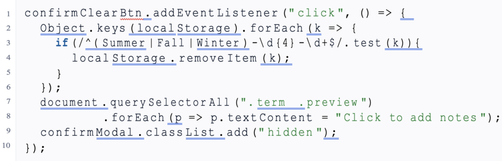 | confirm Clear Btn . add Event Listener (” click “, () => { Object . keys (local Storage ). for Each ( k => { if (/^( Summer | Fall | Winter ) -\ d {4} -\ d+$/. test ( k)){ localStorage . remove Item ( k); } }); document . query Selector All (“. term . preview “) . for Each ( p => p. text Content = ” Click to add notes “); confirm Modal .class List . add (” hidden “); }); |
