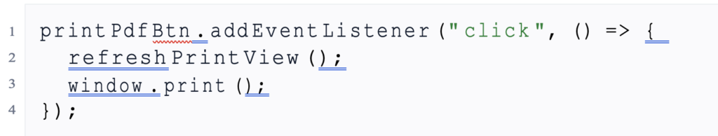 | print Pdf Btn . add Event Listener (” click “, () => { refresh Print View (); window . print (); }); |