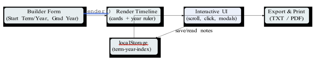 This web app helps you plan your academic journey term-by-term (Summer, Fall, Winter) from your start term to your graduation year. It shows a horizontal timeline with clickable cards. You can type notes for each term, and the app saves them in your browser so they stay there even if you navigate away or close the tab. You can also export your plan as a well-formatted