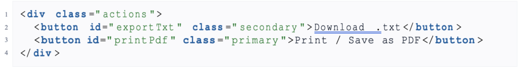 | < div class =” actions ” > < button id =” export Txt ” class =” secondary ” > Download . txt </ button > < button id =” print Pdf ” class =” primary ” >Print / Save as PDF </ button > </ div > |