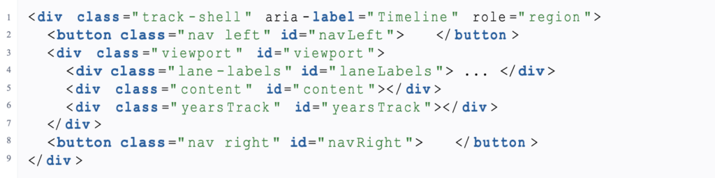 | < div class =” track – shell ” aria – label =” Timeline ” role =” region ” > < button class =” nav left ” id =” nav Left ” > </ button > < div class =” viewport ” id =” viewport ” > < div class =” lane – labels ” id =” lane Labels ” > … </ div > < div class =” content ” id =” content ” ></ div > < div class =” years Track ” id =” years Track ” ></ div > </ div > < button class =” nav right ” id =” nav Right ” > </ button > </ div > |